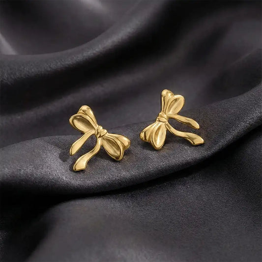 • Anti-tarnish gold knot bow stud earrings placed on light fabric with white flowers, showcasing a delicate knot bow shape and soft shine.