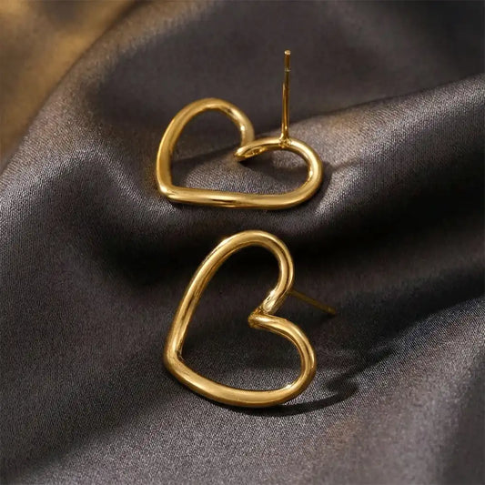 • Anti-tarnish open heart gold stud earrings displayed on beige satin fabric, showcasing the minimal heart shape and glossy gold tone.