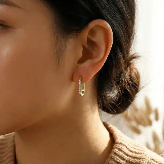 • Anti-tarnish gold rectangular hoop earrings with zircon stones, minimalist soft bling hoops on beige background