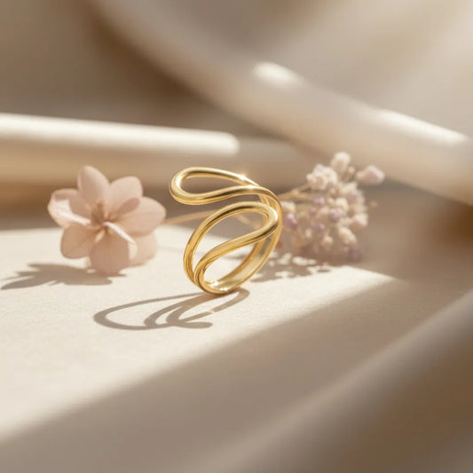 Meet our Gold Double Loop Ring, a perfect piece of modern jewellery. This ring features a unique open bypass design, creating a cool abstract swirl. It's a great minimalist ring that is simple enough for everyday wear. As a stylish open ring, it's comfortable and adjustable.